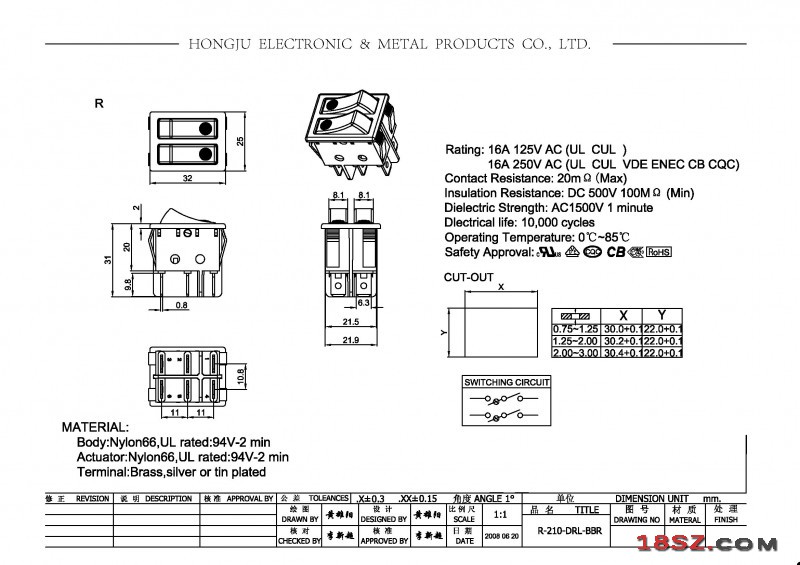 Rating: 16A/125V AC (UL/cUL), 16A/250V AC (UL/cUL/CQC/ENEC/VDE/CB)