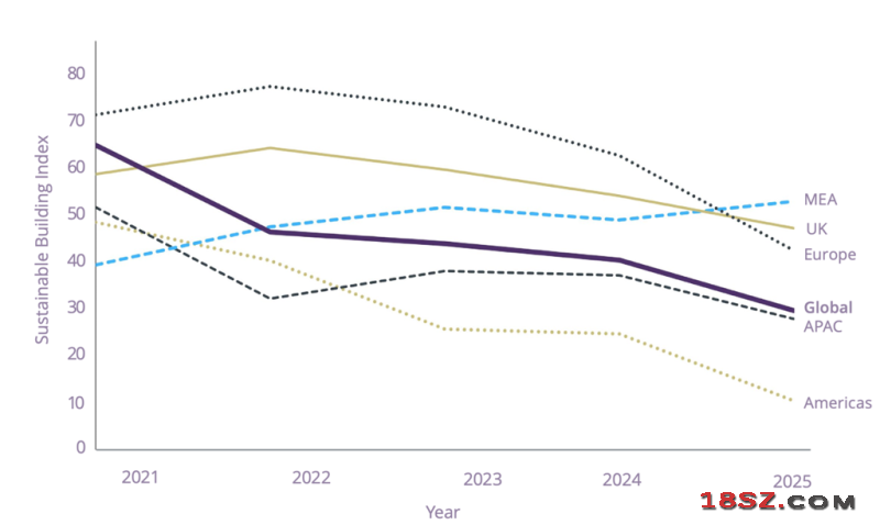 在亚太地区,绿色建筑需求的增长速度也明显放缓,与全球趋势保持一致。其中,美洲地区的降幅最为剧烈,欧洲需求同样趋冷,唯有中东与非洲(MEA)地区的绿色建筑需求仍在持续上升。