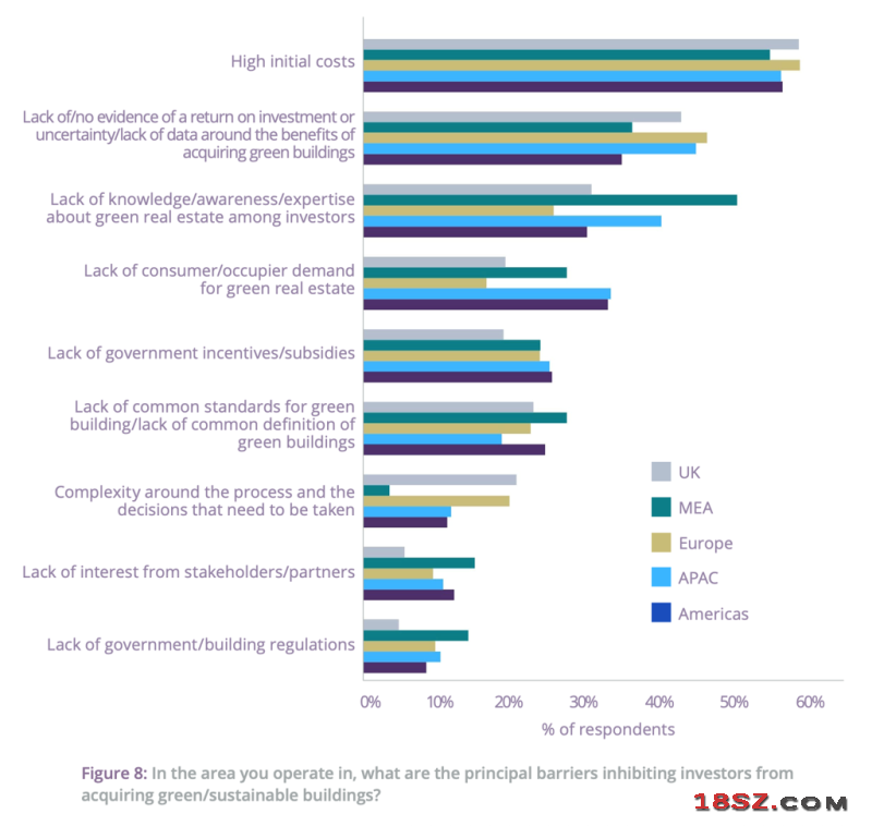 建筑环境永续发展投资的主要障碍是高昂的起造成本。此外,从分析图表发现,美州地区在「缺乏政府激励、津贴」排名最高、亚太地区则在「绿色房地产的消费者/租户需求不足」方面排名最高。(图取自RICS 2025 年全球永续发展报告)