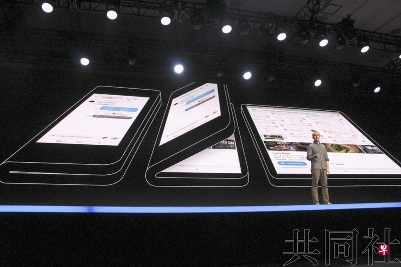 三星在旧金山举行的活动中展示了折叠式智能手机机样。(共同社)